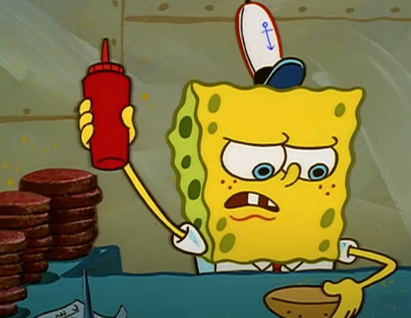 스폰지밥이 게살버거를 만들때 스폰지밥은 재료를 가져와 패티를 굽고 빵위에 패티, 치즈, 피클, 양파, 토마토 양상추, 케첩, 머스타드를 올리고 마지막으로 빵을 올리는 작업을 하면 게살버거가 완성이다.